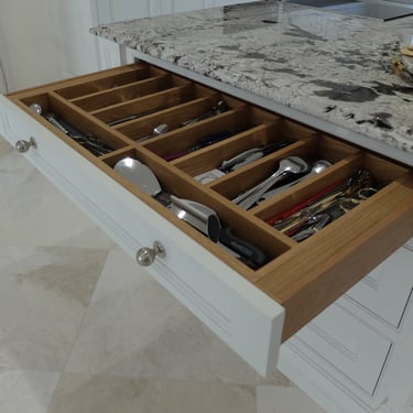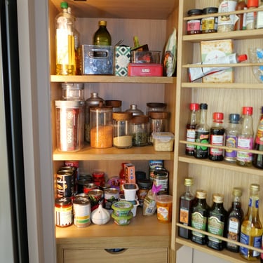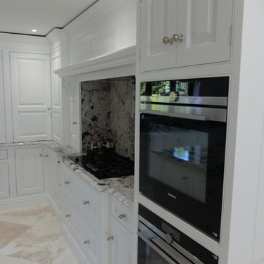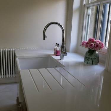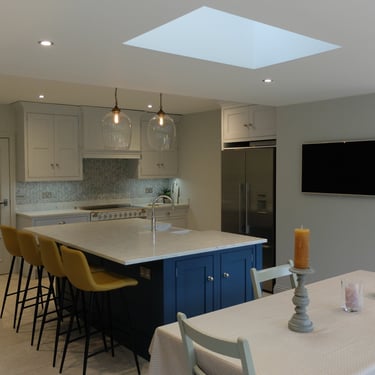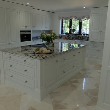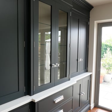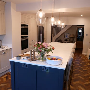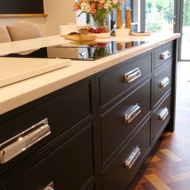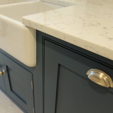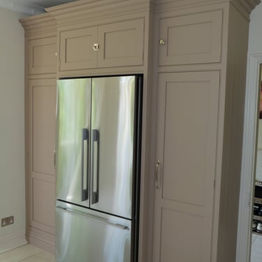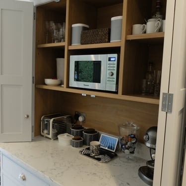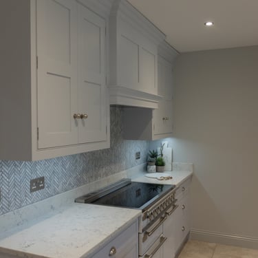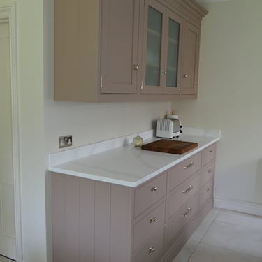 A traditional style kitchen with larder cupboards with internal drawers, Quooker boiling water, painted cabinets and quartz worktops.