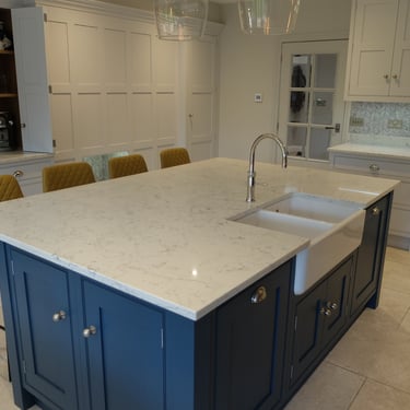 A modern style kitchen with an island unit, painted cabinets and quartz worktops.