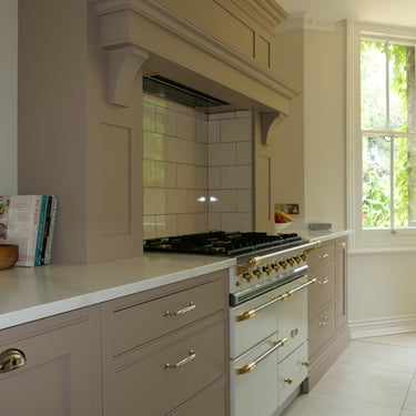 A traditional style kitchen with AGA cooker, painted cabinets and quartz worktops.